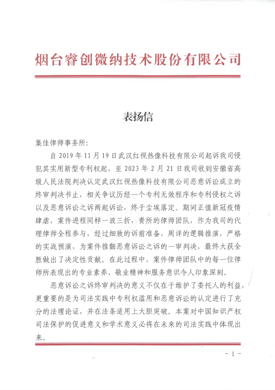 2023年2月10日,安徽省高级人民法院就烟台睿创微纳技术股份有限公司、烟台艾睿光电科技有限公司、安徽英睿系统技术有限公司等(下称“睿创集团”)与武汉红视热像科技有限公司(下称“武汉红视”)因恶意提起知识产权诉讼损害责任纠纷一案作出终审判决,认定武汉红视滥用诉权的行为构成恶意诉讼,并判令其赔偿睿创集团相应的合理支出。至此,时隔四年,横跨疫情时代的专利侵权及恶意诉讼系列纠纷案,终于尘埃落定。玩球直播协助睿创集团最终取得系列案件的全面胜利,维护了客户合法权益,实现了商业竞争的公平正义!