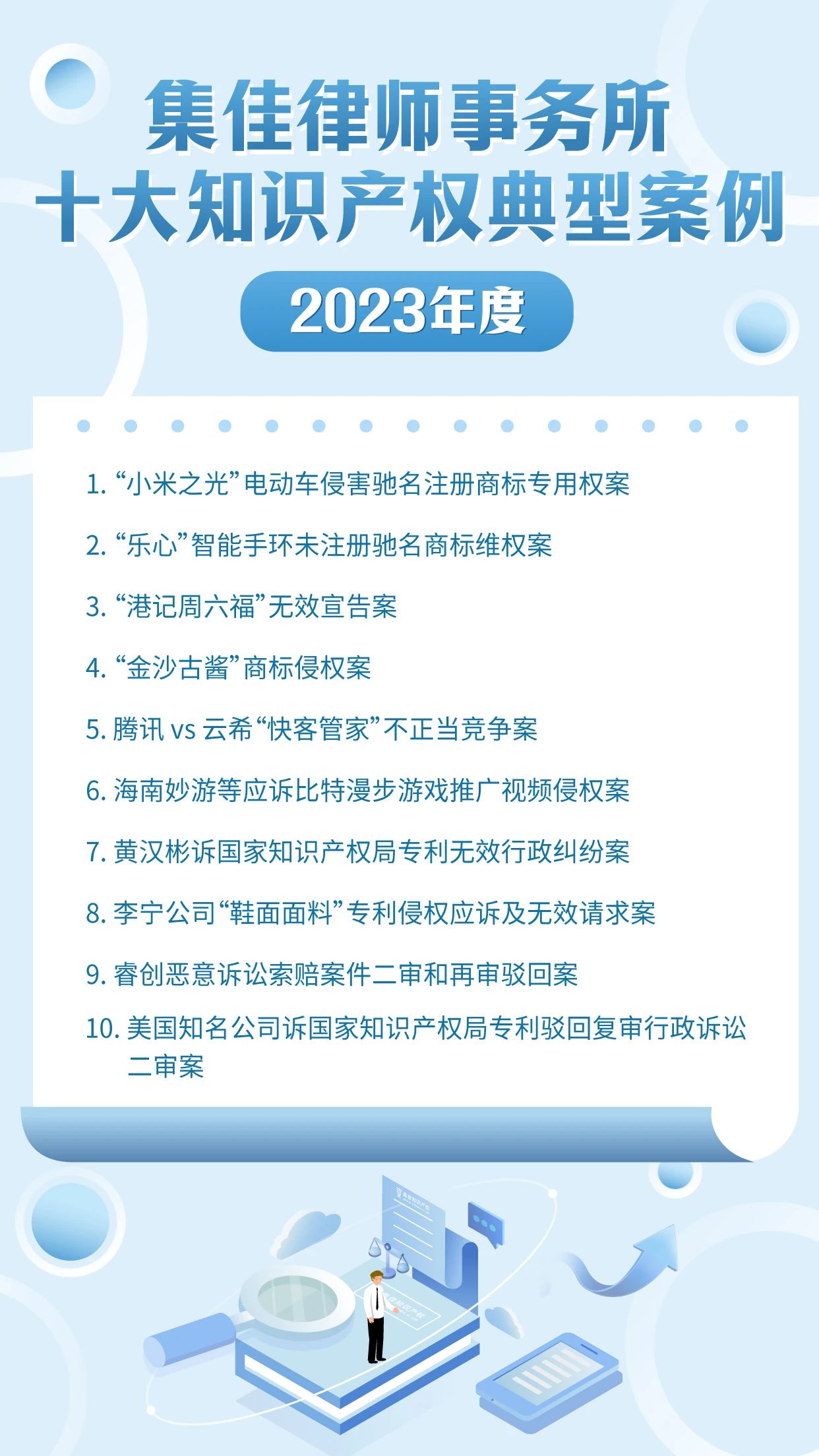 作为迎接4.26世界知识产权日的献礼之一,玩球直播已连续十年开展十大知识产权典型案例的评选活动,其意义不仅在于展现集佳律师团队的专业能力和水准,更在于传递集佳全方位服务客户的理念。在第24个世界知识产权日来临之际,玩球直播从2023年度代理的众多知识产权案件中筛选出具有代表性的十大案例,与各界同仁分享: