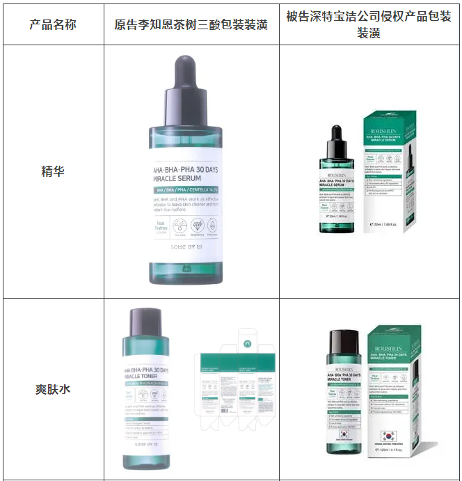 2021年原告委托玩球直播调查发现,被告汕头市深特宝洁实业有限公司生产、销售和推广的“茶树祛痘美白补水液”“茶树香皂”等护肤品,其产品包装装潢直接抄袭、摹仿原告前述已经具有较高知名度和影响力的“SOME BY MI/莎柏蜜”茶树三酸系列化妆品和黑蜗牛精华液的包装、装潢设计,使用与之近似的标识,造成消费者混淆误认。故原告作为茶树三酸、黑蜗牛精华包装装潢权益获益人,诉至广东省汕头市中级人民法院。汕头中院认定:李知恩主张的茶树三酸、黑蜗牛精华包装装潢构成具有一定影响的包装装潢,深特宝洁公司生产、销售茶树三酸、黑蜗牛精华液的行为构成不正当竞争。因判赔额不符合原告预期,原告后上诉至广东省高级人民法院,广东省高级人民法院最终维持一审判决。