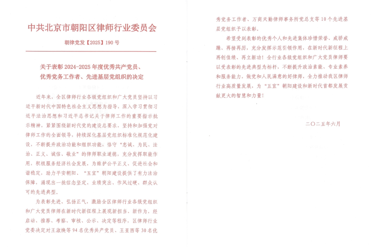 6月27日,朝阳区律师行业党委召开了朝阳区律师行业庆祝中国共产党成立104周年暨总结表彰大会,玩球直播联合党支部党员黄莺荣获“朝阳区律师行业优秀共产党员”称号,支部党员汪琨荣获“朝阳区律师行业优秀党务工作者”称号。